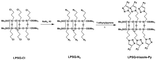 Synthesis of LPSQ-triazole-Py via copper(I)-catalyzed azide-alkyne cycloaddition of 1-ethynylpyrene to LPSQ-N3 (obtained from LPSQ-Cl precursor).