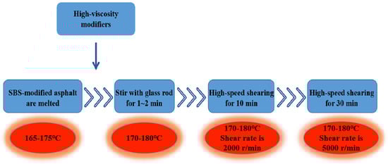 A small high-speed shear meter from the PRIMIX company was used to prepare the high-viscosity asphalt binders. The preparation process is shown in Figure 2. After the fabrication of modified asphalt, the dynamic viscosity at 60 °C of the two kinds of modified asphalt were detected according to method T 0620 specified in Standard Test Methods of Bitumen and Bituminous Mixtures for Highway Engineering in China (JTG E20-2011) [18]. According to the results, the dynamic viscosity at 60 °C of the type I and type II modified asphalt are 10.34 × 104 Pa·s and 12.08 × 104 Pa·s, respectively. Therefore, the type II seems more viscous than type I.