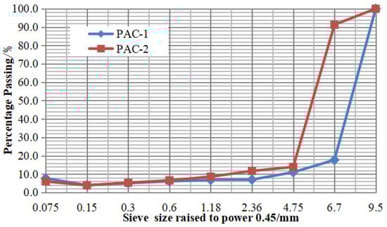 To evaluate the influence of aggregate gradation on the mechanical properties of the asphalt mixture, two gradations, coarse (PAC-1) and fine (PAC-2), were selected in this study. The nominal maximum particle sizes of PAC-1 and PAC-2 were 9.5 mm and 4.75 mm, respectively. The two designed gradations are shown in Table 5 and the grading curves are shown in Figure 4.