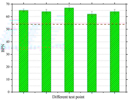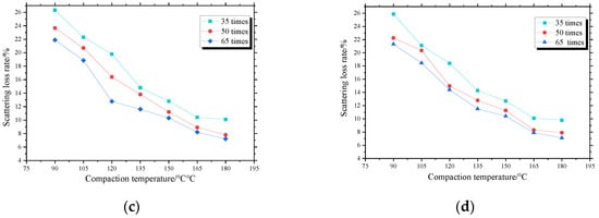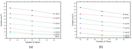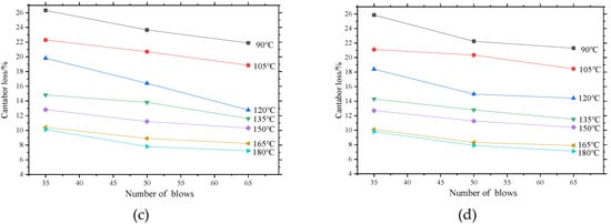 It can be seen from Figure 5 that under the standard raveling condition (300 revolutions at speed of 30–33 r/min), the Cantabro loss of the four kinds of asphalt mixture decreases with the increase of the number of blows. Moreover, when the number of blows increases from 35 to 50, the decrease in the Cantabro loss of the Marshall sample decreases compared with the increase from 50 times to 65 times. It can be inferred that when the compaction work increases to a certain extent, increasing the number of blows does not have much effect on the improvement of the raving resistance of the mixture. This phenomenon is more pronounced when the compaction temperature reaches 165 °C or higher.