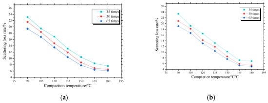 Figure 7 and Figure 8 indicate that for three numbers of blows, the mass loss rates of the four asphalt mixtures decrease with the increase of compaction temperature and decrease becomes smaller and smaller. For asphalt mixtures PAC-1-I and PAC-1-II, when the compaction temperature exceeds 105 °C, the mass loss rates of all samples are less than 20%, meeting the requirements of the specification [21] for open grade asphalt mixtures. When the compaction temperature exceeds 135 °C, the mass loss rates of all samples are less than 15%. When the compaction temperature exceeds 150 °C, the mass loss rates of all samples are less than 10%, with the exception of the sample compacted 35 blows. Therefore, in order to ensure the engineering performance of the overlay, the initial rolling temperature of the asphalt mixture of PAC-1 should not be lower than 150 °C during construction. For the asphalt mixtures PAC-2-I and PAC-2-II, with the exception of the sample that compacted 35 blows. All the samples have a Cantabro loss rate of less than 20%, 15%, and 10%, when the compaction temperature exceeds 120 °C, 135 °C, and 165 °C, respectively. Therefore, the initial rolling temperature of PAC-2 should not be lower than 165 °C in order to ensure the engineering performance of the overlay.