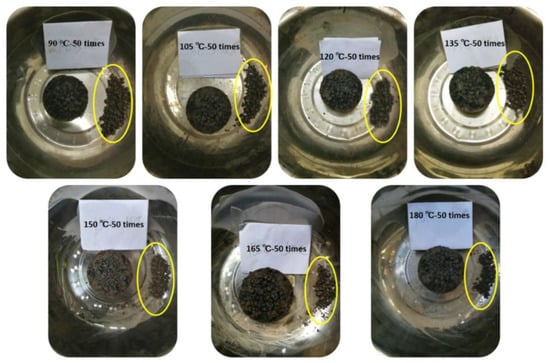 During Marshall samples fabrication process, the number of blows was set for double-sided compaction at 35 times, 50 times, and 65 times. Furthermore, the compaction temperatures were 90 °C, 105 °C, 120 °C, 135 °C, 150 °C, 165 °C and 180 °C, respectively. Then, the raveling resistances of Marshall samples were tested by Cantabro test and the losing weight during the abrasion process was recorded.