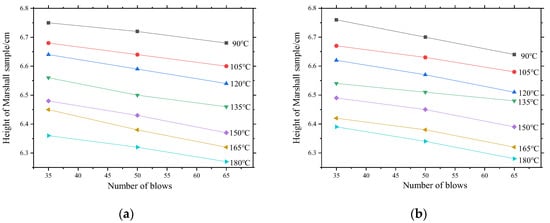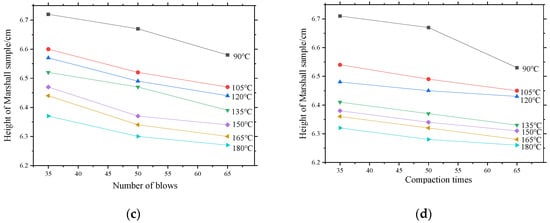 The height variation curves of the Marshall samples of the four asphalt mixtures with different numbers of blows are shown in Figure 9. The figure reveals that with different compaction temperatures, the height of the sample decreases as the number of blows increases. For the asphalt mixture PAC-1-I, when the compaction temperature is 150 °C, the height of the Marshall sample with different numbers of blows meets the specification (6.35 ± 0.22 cm). Therefore, 150 °C is considered to be the critical temperature at which the asphalt mixture PAC-1-I reaches an acceptable height. Similarly, the critical temperatures for asphalt mixture compaction for PAC-1-II, PAC-2-I, and PAC-2-II are 150 °C, 150 °C, and 135 °C, respectively.