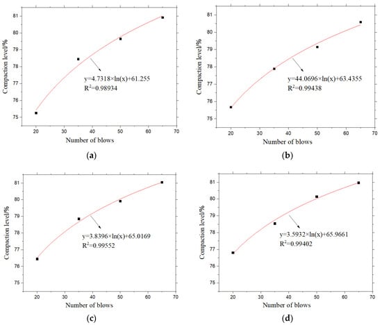 The relationship between the density of the sample and the number of blows is established, and the results are shown in Figure 10. The design void ratio of the four asphalt mixtures are all 20%. It is believed that the target air void is realized when the compaction of the mixture reaches 80%. Therefore, the number of blows when the compaction of the mixture reaches 80% is calculated from the fitting curve, which is the number of blows required for Marshall samples in the laboratory. The number of blows for PAC-1-I, PAC-1-II, PAC-2-I, and PAC-2-II were 53, 59, 50, and 50 times, respectively.