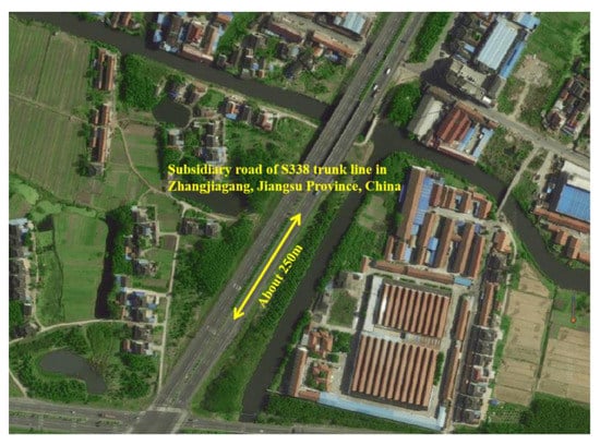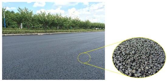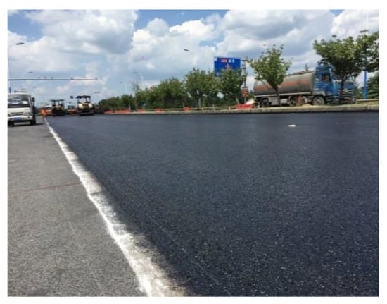 The location of the test section is near a subsidiary road on the S338 trunk line in Zhangjiagang, Jiangsu Province, China. The test section has a total length of about 250 m and a width of 11.75 m, as shown in Figure 11. The PAC-1-II asphalt mixture was used for paving. The thickness of the overlay is 2.0 cm, the tack coat is made of SBS-modified emulsified asphalt, and the sprinkling rate is controlled at 0.8–1.0 L/m2. Because the lower layer is a new pavement of SMA-16, there was no need for special treatment of the lower layer before construction. The test section was paved in September 2018. The overall construction quality was excellent, the surface of pavement was flat and compact, and there were no obvious rolling traces.