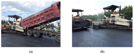 Firstly, the asphalt mixture temperature was measured, as the specified temperature should not be lower than 165 °C. The unloading trucks need to be insulated to prevent the temperature from falling too fast. Two asphalt mixture pavers were used for joint paving, which were 5 to 10 m apart. Each paver is equipped with a temperature display device to measure the temperature of the asphalt mixture during the paving process. The paving temperature was controlled at between 155 and 170 °C, and the thickness of loose paving was between 2.2 and 2.3 cm. The unloading and paving process is shown in Figure 14.