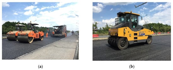 The compaction work was carried out immediately after the asphalt mixture had been paved. For the new and old working face joints, a small vibratory compactor was used to repeatedly compact 5 to 6 times. After the joint was processed, the steel roller started to compact. Please note that in order to prevent sticking and prevent the temperature of the asphalt mixture dropping too fast, the steel roller and rubber roller were manually oiled, and no watering was carried out. According to the results reported in above sections, the initial compaction temperature was set to 150 to 165 °C, and the steel roller was used to compact the pavement 2 times. The intermediate was carried out immediately after breakdown by using steel roller to compact the pavement 3 times. Finally, the rubber roller was used to compact the pavement 5 times. The compaction process is shown in Figure 15.