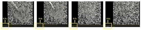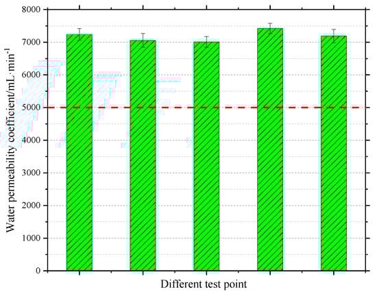 Pouring water onto the pavement was used to simply determine the drainage performance of the overlay. A video screenshot is shown in Figure 19. It can be clearly seen that the overlay drains quickly, and it takes less than 3 s from the start of pouring water to drain all the water. It appears that the overlay has rich interconnected voids inside it to meet the drainage requirements. To verify the drainage performance of the overlay more accurately, a drainage coefficient test was carried out to evaluate drainage performance according to the T 0623 method specified in Standard Test Methods of Bitumen and Bituminous Mixtures for Highway Engineering in China (JTG E20-2011) [18]. The test results shown in Figure 20 indicate that the water drainage coefficient of the overlay at different measuring points reached 7000 mL/min, indicating that the drainage performance of the test section is excellent.