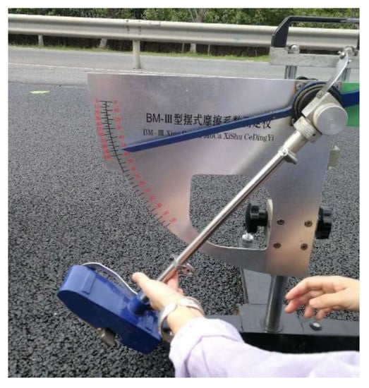 The pendulum friction test and sanding patch method was used to evaluate the skid resistance of the test section, as shown in Figure 21. Figure 22 shows that the British Pendulum Number (BPN) value obtained by the pendulum friction test is about 64, which satisfies the specification requirements [21] and ensures the skid resistance of vehicles during low-speed travel. In addition, continuous road performance surveys have been conducted since the PUTO construction with an interval of 12 months and the BPN value of the original pavement was also detected, as shown in Table 8. According to the survey results, although the BPN value of PUTO represent slight downwards trend, the BPN values of PUTO are always greater than that of original pavement, even after 2 years. Therefore, the PUTO does show great skid resistance.