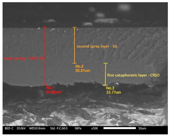The thickness of the coatings was measured with the thickness gauge, obtaining the results summarized in Table 2. These values represent the average of 50 measurements performed on 5 samples (10 measurements per sample) for each series. The second layer’s thickness in the samples C-SG and CfGO-SG was evaluated by difference between the thickness of the total coating and the one of the first cataphoretic layer.