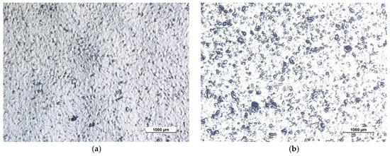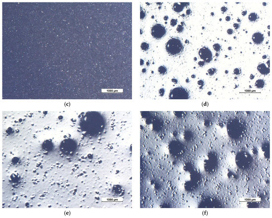The presence of fillers, in addition to influencing the internal structure of the coatings, significantly alters their surface morphology. Figure 2 shows the micrographs of the six sample series, observed via an optical microscope. The two coatings obtained with the cataphoretic process, samples C and CfGO, show a low roughness surface morphology. In the coating containing 0.2 wt % of fGO there is a slight increase in porosity and bubbles, as previously observed [47,59]. The presence of the graphene-based fillers, in fact, causes the development of hydrogen bubbles during the electrodeposition process. The large amount of graphene flakes gives rise to significant changes in the morphology of the layers obtained by the spray deposition process. While the layer made only with the acrylic matrix (Figure 2c, sample S) possesses a flat surface (there is no colour contrast in the image obtained with a polarizing filter), the SG sample (Figure 2d) shows high surface irregularity due to the high tendency of graphene flakes to aggregate in polymeric matrices [51,52].