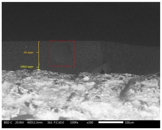 Nevertheless, in addition to surface accumulations, the SG layer possesses also internal defectiveness. In fact, the coatings deposited by spray technique often show a not negligible internal porosity, due to the air flow employed in the paint spray process. Figure 4 shows, as an example, the cross section of sample CfGO-SG, in which a large bubble can be observed inside the external layer (SG).