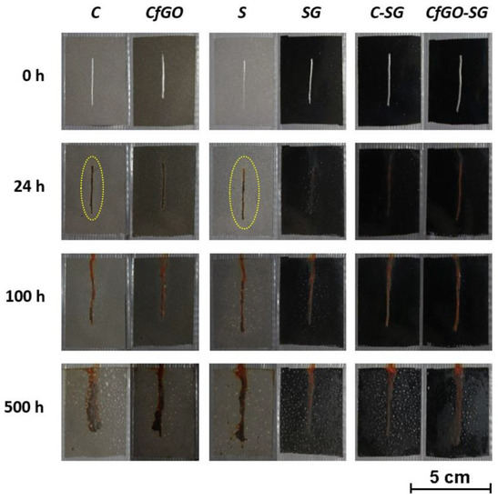 The level of defectiveness in the single layer samples increases during the first 100 h of exposure, as expected. Regarding the double-layer coatings, the first blisters appear on the surface of sample C-SG, while the CfGO-SG coating is still defects free. The latter sample, in fact, consists of two layers, the first of which (layer CfGO) was deposited to provide high protective properties, based on the results highlighted by the previous work [47]. Similarly, sample CfGO always shows a better behavior than coating C, free of filler, throughout the accelerated corrosion test.