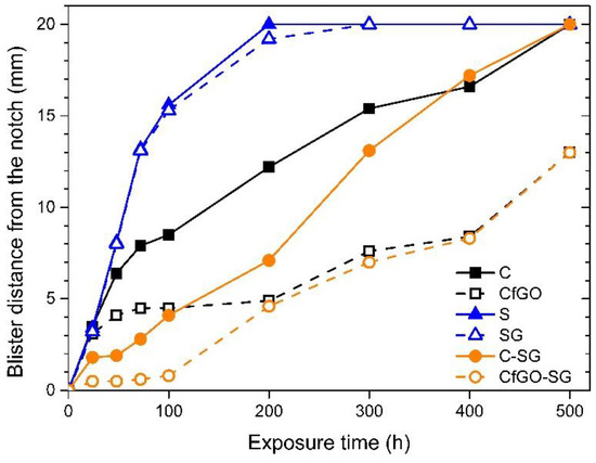 At the end of the test, after 500 h of exposure, all the samples show evident defectiveness. The blisters cover the entire surface of the samples, except for coatings CfGO and CfGO-SG. In these two cases, the blisters developed near the artificial notch, but they did not reach the lateral edges of the samples. Once again, the layer CfGO seems to provide a good protective contribution, improving the acrylic matrix performance, both as a single coating and as a primer for the subsequent spray deposition.