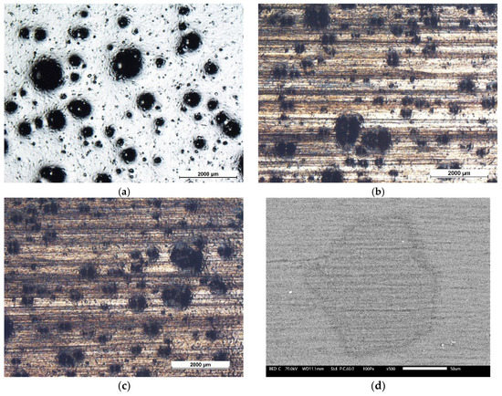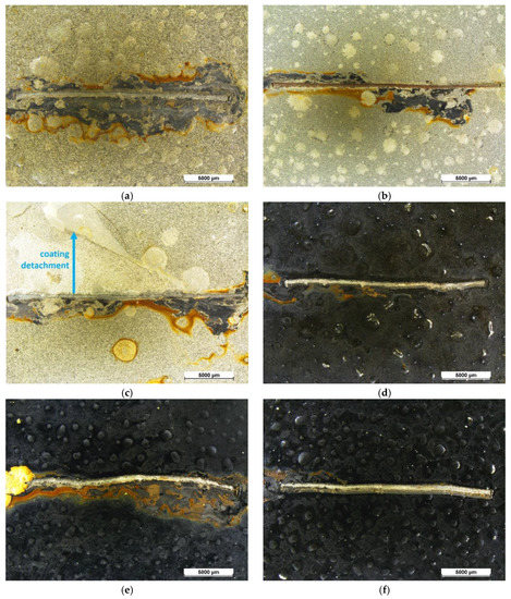 The evolution of samples degradation associated with the absorption of water inside the coatings is pointed out by monitoring the blisters’ development (Figure 6). The distance from the artificial notch to which the blisters are observed is directly connected with the adhesion of the coating: the greater this distance, the greater the aggressive solution absorption inside the layer, with a consequent decrease in adhesion with the metal substrate.