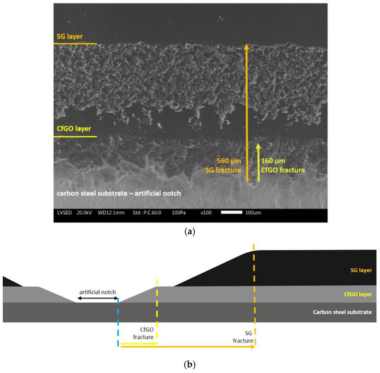 According to the standard [65], an organic coating with good adhesion to the substrate should show maximum detachment from the notch area of about 1000 μm. The corrosion that occurred below the coatings shows that these samples do not comply with this requirement. Moreover, the actual detachment of the spray layer S (shown by the arrow in Figure 7c) also occurred during the drying step of the samples by compressed air flushing, as a symptom of poor adhesion. The adhesion specification of the standard [65] was respected only by sample CfGO-SG, which did not show evident detachments of the coating due to the development of corrosion products. Figure 8a reveals the different behaviour of the two layers of sample CfGO-SG, observed by SEM in a top-view, while Figure 8b represents the schematic cross section of the system. The cataphoretic primer shows a small fracture (at the bottom in the image), equal to 160 µm in length. Differently, the volume increase of the corrosion products provoked a more acute removal of the SG top-layer (at the top of the image). However, the delamination of the coating is negligible, confirming the good adhesion properties of the coating. The adequate adhesion values of this sample is mainly due to two factors: the high thickness, which limits the absorption of the solution, and the highly protective CfGO primer layer. The combination of these two elements allows sample CfGO-SG to stand out over the other coatings, as previously highlighted in Figure 6.
