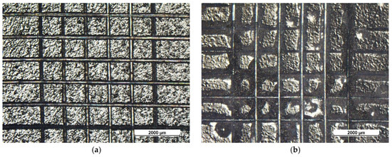 The adhesion features were also evaluated by Cross Cut Test, performed before and after the exposure of the samples in the salt spray chamber. Despite the different nature of the coatings, all the samples showed similar behavior. Before the salt spray test, the coatings possess good adhesion, equal to value 5B of the standard [67]. 5B is the highest degree of adhesion defined by the standard, where the edges of the cuts are completely flat and the grid shows no detachment. Differently, after 500 h of exposure in an aggressive environment, the absorption of water in the coatings caused the collapse of the adhesion values with the metal substrate. In this case, the visual results reflect grade 1B of the standard [67]. The surface of the coating that peeled off after the measurement varies between 35% and 65%. Figure 9 shows, as an example, the comparison of the test results on the surface of the coating C, before (a) and after (b) exposure in salt spray chamber.