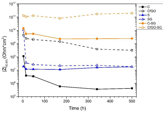 As a preliminary approach, EIS measurements produce quantitative results on the behavior of the coatings. By monitoring the evolution of the impedance module measured at low frequencies (10−2 Hz), defined as |Z|(0.01), it is possible to get a first estimate of the degree of protection supplied by the coating. According to the literature [72,73,74], in fact, a coating must show a value of |Z|(0.01) above 106 Ω*cm2 to be able to provide adequate protective guarantees. Thus, the samples of the six series of coatings were subjected to EIS measurements, evaluating the progress of their impedance module |Z|(0.01) over time. Figure 10 shows the variation of |Z|(0.01) during the test.