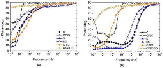 The decrease in |Z|(0.01) occurs mainly during the first 24 h of immersion in the test solution. Typically, the first hours of tests are very critical for organic coatings, which can experience solution absorption phenomena. At the beginning of the measurements, the defectiveness of the layers assumes great importance. Figure 11 shows the Bode Phase diagrams of the six series of samples at the beginning (a) and after the first 24 h (b) of immersion in the test solution.