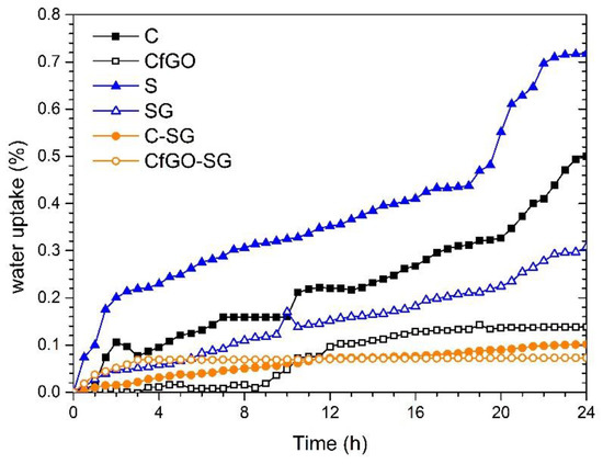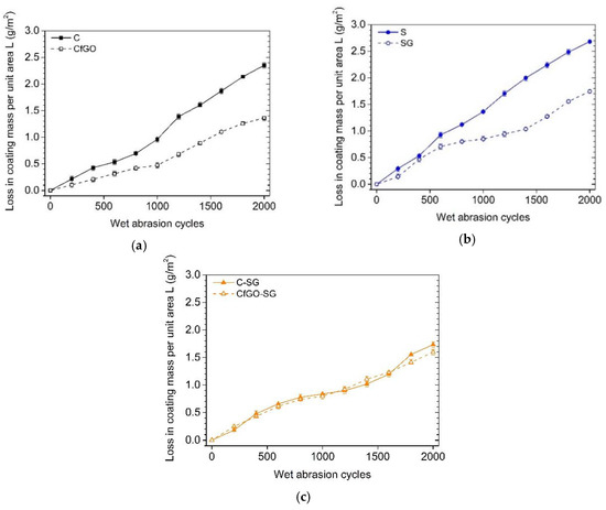 Finally, the self-lubricating effect of graphene flakes and their good compatibility with the polymer matrix improved the wet abrasion resistance of the top coat. As a matter of fact, the scrub test revealed a good abrasion resistance of the SG layer, which positively influenced the protective performance of the double layer coatings C-SG and CfGO-SG.