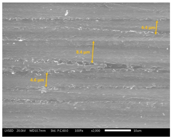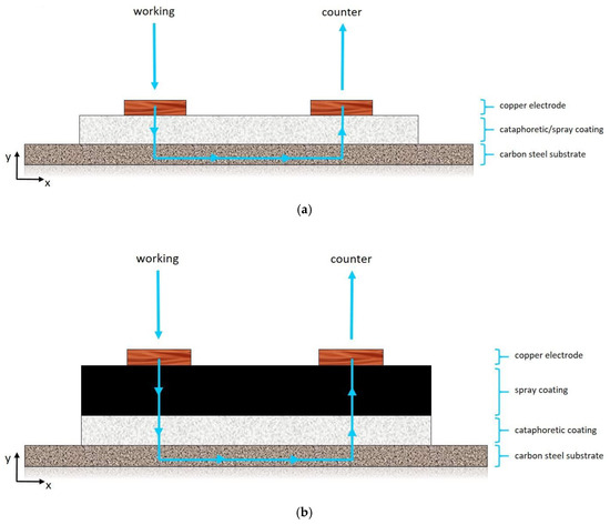 The conductivity of the layers, influenced by the graphene-based filler, was assessed following the ASTM D 257-07 standard [68], as already described in a previous work [47]. Two copper electrodes (sheets of 25 mm × 5 mm × 0.01 mm) were positioned in parallel to the sample’s surface, at a distance of 15 mm. The potentiostat Parstat 2273 was used to apply 10 V between the two electrodes, employing the PowerSuit ZSimpWin software, evaluating the filler contribution on the conductivity behavior of the composite coatings.