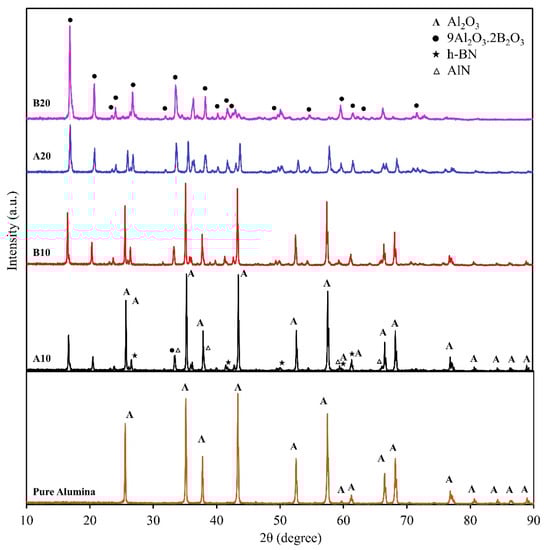 The XRD peaks were identified using the crystallography open database (COD) [35]. All the peaks were identified, suggesting that the phases are Al2O3 (COD 9007634), 9Al2O3·2B2O3 (COD 9005085, aluminum borate), h-BN (COD 5910079), and AlN (COD 1010514), as shown in Figure 2. The peaks are only denoted by symbols in pure alumina sample and A10 and B20 spectrum, to avoid the clustering of symbols. The Al2O3, h-BN, and AlN peaks are denoted in A10 composite spectrum, whereas aluminum borate peaks are highlighted in B20 composite spectrum. The same peaks can be seen in all the spectrums with changes in intensities. For example, the peaks of Al2O3 can be clearly seen in A10 composite, and its peak intensity decreases with the addition of B2O3 due to the formation of aluminum borate. These XRD peaks suggest that the B20 composite will have the highest aluminum borate concentration. Figure 2 also confirms the formation of h-BN, as the h-BN peaks can be clearly observed in A10, B10, and A20 composites. In B20 composite, h-BN peaks are suppressed to a high amount of aluminum borate. Small intensity peaks of AlN were also observed that suggest the presence of unreacted AlN in the matrix.