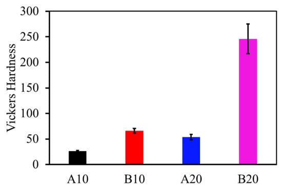 The Vickers hardness values of the composites are plotted in Figure 3. The effect of different phases can be clearly observed in the hardness values. For example, B10 has higher hardness than A10. Similarly, B20 has higher hardness than A20. This behavior is due to the amount of aluminum borate phase in the matrix, because aluminum borate has a higher hardness. The maximum amount of aluminum borate in composite B20 results in the maximum hardness of 246 ± 29 HV. The hardness of the pure alumina sample was observed to be 28 ± 6 HV, which is close to the hardness of the A10 composites.