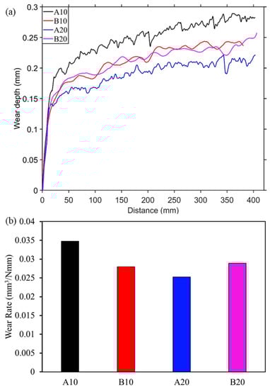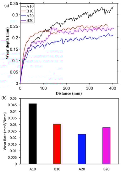 The observed coefficient of friction (COF) variations over the distance against alumina ball and steel ball are shown in Figure 6a,b, respectively. Against alumina ball, the lowest COF at the end of the test was observed for A10 composite (that is, 0.42); COF increased gradually, and the highest COF of 0.75 was observed for B20 composite. This COF trend is related to the phases present in the composites. As shown in XRD results (Figure 2), h-BN was present in the composite, which is a solid lubricant material used to lower the COF. However, the presence of aluminum borate lowered the h-BN amount in the matrix. This relative amount of h-BN and aluminum borate suggests the observed trend in COF against alumina ball. The average COF for pure alumina sample against alumina ball and steel ball was 0.83 and 0.81, respectively, which was higher than all the composites.