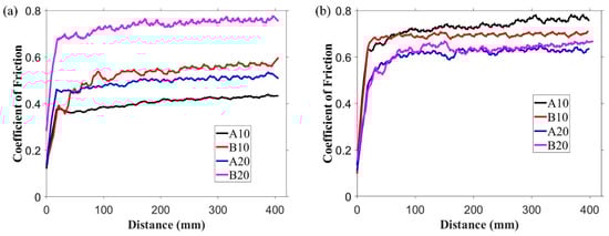Coefficient of friction (COF) variation over the sliding distance against (a) alumina ball and (b) steel ball.