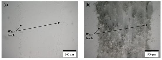 Optical micrographs of wear track on A10 composite after reciprocating sliding test against (a) alumina ball and (b) steel ball.