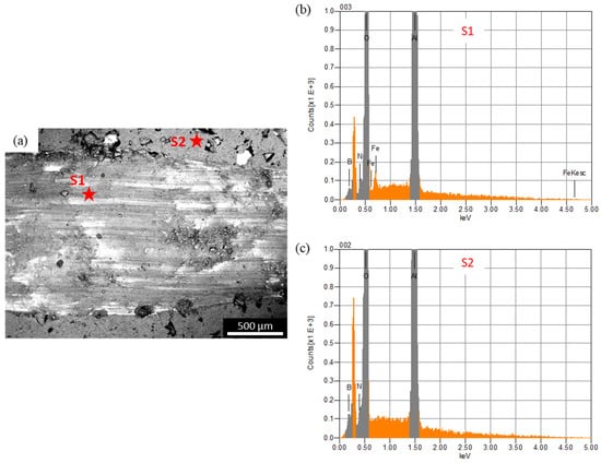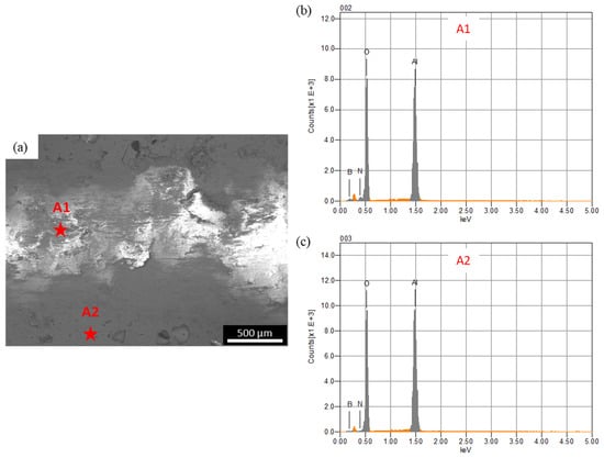 In the case of the steel ball, the friction was higher than the alumina ball, and an opposite trend was observed, compared to the COF trend observed against the alumina ball. This was because the steel ball had a lower hardness than the alumina ball. Moreover, during sliding, the steel ball wore out and transferred to the composite surface, as shown in the optical image of wear track of A10 composites (Figure 7b). The wearing out behavior of steel ball was observed against pure alumina sample and all four composites, which was further confirmed by EDS analysis of the wear track. SEM micrograph and EDS spectrums of the wear tracks on the B20 composite against alumina and steel ball are shown in Figure 8 and Figure 9, respectively. The EDS spectrum at S1 point on wear track against steel ball confirms the presence of Fe (Figure 9b). The EDS spectrum are also taken outside of the wear track (S2) that shows no Fe, confirming that the source of Fe is the counter steel ball. The EDS spectrum on (A1) and outside (A2) of the wear track generated against alumina shows the expected elements, which are Al, O, B, and N.