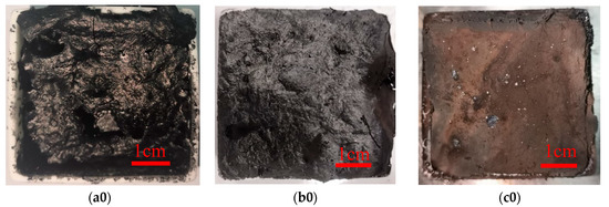 According to the above analysis, it is found that the barrier layer formed by the residue may play an important role to improve the flame retardancy performance of asphalt. For this reason, Samples 2, 7, and 8 were heat-treated in a muffle furnace, and then digital cameras and field emission scanning electron microscopes were used to characterize the surface morphology of the residue, as shown in Figure 8.