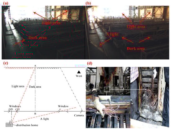 The fire site monitoring was investigated, but the fire point was not directly found. Through video frame cutting technology, the Figure 1a shows that the transmitted light irradiated into the plant building at a certain moment, and a light area was formed. the distribution room located in the east was inferred to be a fire point. After 3 min and 58 s, Figure 1b shows a light suddenly appearing in the bottom left region of the video, and the light area became brighter. According to the principle of the linear propagation of light and the structure of the site, a video analysis diagram of the fire scene is drawn in Figure 1c. Line AEis associated with Line EF at point E, and based on the similarity principle of triangles (ΔABC ≈ ΔEDC); the Length of line CD is 3120 mm. When Line CD is an element of (2930 mm, 4160 mm), E is placed at the northwest window of the distribution room, and we doubt that E was the origin of the fire. A detailed inspection of the distribution room was carried out, as shown in Figure 1d. The west wall of the distribution room had a remarkable V-shaped crack that was peeling. It also can be seen in Figure 1d that the peeling crack mark combustion termination line differed with respect to a horizontal line. This is because the flames spread south under the influence of the wind from the north.