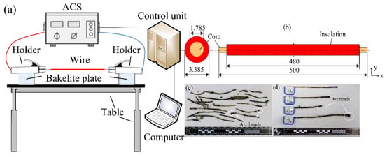Images of the experimental system: (a) schematic of the experimental apparatus, (b) wire configuration (mm), (c) Overcurrent arc beads (OABs) from the fire scene, and (d) experimentally produced OABs.