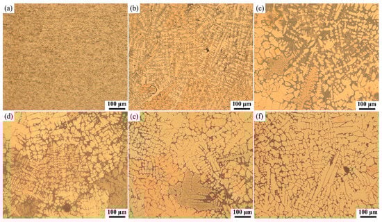 The experimental metallographic images from the experimental OABs (400–700% overcurrent) are shown in Figure 4c–f. With increasing current, the length of the lateral secondary dendrite arms decreased, and the directionality of the dendrites also decreased. At a 700% overcurrent, the grains were almost cellular. This process can be interpreted as arc and Joule heat crystallizing and solidifying the copper wires. The grain growth of pure metals is mainly related to the heat transfer, and the heat diffusivity is much faster than the mass diffusivity []. At the solid–liquid interface frontier, when the temperature of the liquid phase line is higher than the actual temperature in the liquid phase and the temperature gradient is negative, a “component supercooling” zone will be formed in the liquid phase of the solid-liquid interface frontier, the solid–liquid interface is unstable, and both protuberances and pits appear at the solid–liquid interface simultaneously [].