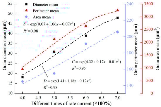Figure 5 shows the variation of the grain diameters (D), perimeters (C), and areas (S) under different conditions of overcurrent. The grain morphology changes with the increase in the current.