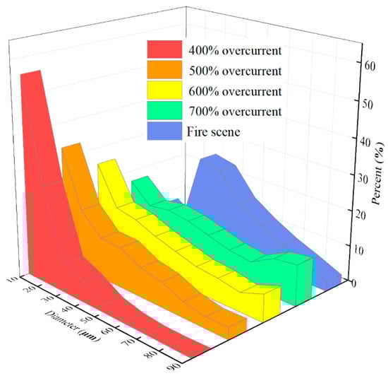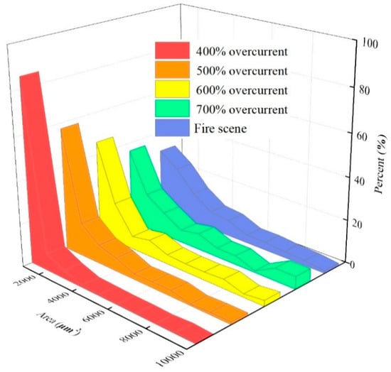Figure 6 and Figure 7 show the variation in the specific average diameter and area of OABs versus the different overcurrent intensities. When the overcurrent was 400%, the grain percentage tended to reach zero as the diameter increased, which is similar to the average area. However, the distribution of diameter tends to be stable under the condition of high-power overcurrent, which means that the proportion of grains with a larger diameter and area increases, and with the increase in the overcurrent intensity the grain proportion of larger diameter and area increased, and with the increase in the overcurrent intensity the proportion of grains with a larger diameter and area also increased. Thus, the overcurrent intensity has a positive influence on the growth of the grain diameter and area. The average diameter of OABs at the fire scene was mainly 30 nm, because the OAB solidification was affected by external factors that interfered with the fire.