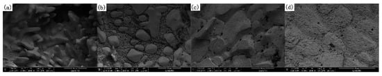 Figure 8 shows the microscopic morphology of the hole surface of the OABs versus different overcurrent intensities at a magnification of 2000×. At a 400% overcurrent, the inside of the holes was rough, the primary dendrites were sharp and developed, and the secondary dendrites were also developed.