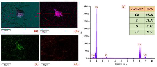 Energy dispersive spectroscopy spectrum for the 400% overcurrent of arc beads: (a) total element mapping, (b) content, (c) O mapping, and (d) C mapping. (e) element distribution mapping