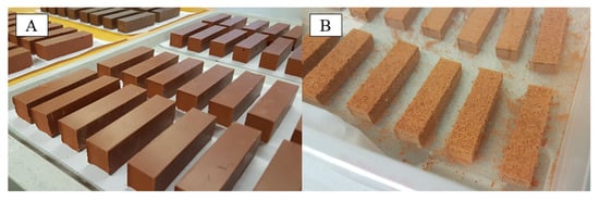 Geopolymer prisms MK54 (80 mm × 20 mm × 20 mm) before (A) and after 17 h in sulfuric acid solution (pH 1) (B), where the corrosion due to the erosion of the geopolymer specimen surface is already visible.