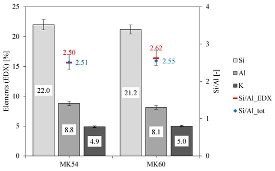 The relative errors of the elements obtained by SEM-EDX analysis for MK54 were 3.9% (Si), 4.2% (Al), and 2.8% (K), and 3.6% (Si), 3.8% (Al) and 2.5% (K) for MK60. With these values, the absolute errors of elements could be calculated, which were 0.86% (Si), 0.37% (Al), and 0.14% (K) for MK54, and 0.76% (Si), 0.31% (Al) and 0.13% (K) for MK60. Furthermore, mean Si/AlEDX ratios of 2.50 (0.21) for MK54 and 2.62 (0.20) for MK60 could be calculated (absolute errors in brackets), also illustrated in Figure 4 as Si/AlEDX.