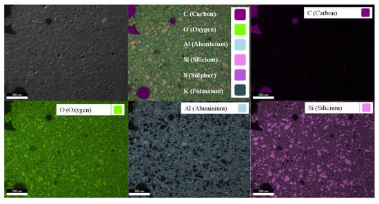 The element distribution in MK54 was illustrated in the EDX elemental mapping in Figure 5, showing the superposition of all chosen elements (upper-middle image) as well as elements C (carbon), O (oxygen), Al (aluminum), Si (silicon), S (sulfur), and K (potassium) separately. Superposition of all elements and the C-image showed that carbon is generally associated with large pores or defects in the structure of geopolymer, as those regions are filled with epoxy resin from sample preparation and therefore are detected as carbon by SEM-EDX. Comparing Si- and Al-images indicated that the high quartz content of metakaolin was more or less evenly distributed in the geopolymer gel. Bright purple spots in the Si-image were quartz particles, which were dark spots in the corresponding Al-image, without showing signs of the color representing Al. This proved that the bright purple spots were not a geopolymer reaction product, as this would also be visualized in the Al-image. The quartz particles embedded in the geopolymer gel did not dissolve in an alkaline media, at least not to any relevant extend, and remain mainly as an inert filler within the hardened binder [59,60,61]. This fact led to the large deviations of Si/Al ratios as represented in Table 1. Si/Altot was calculated from the chemical composition of metakaolin with a quartz content of 39.6%. Si/Alam only considered the amorphous Si and Al from metakaolin. For this reason, the value was close to 1, which corresponded to the Si/Al ratio of pure (meta) kaolinite.