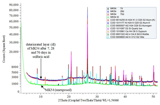 Comparing powder X-ray diffraction patterns of unexposed geopolymers and the deteriorated layers of MK54 and MK60 reveal new crystalline phases (gypsum, alunogen, alum-(K)). These phases occur due to the exposure of specimens to sulfuric acid at pH 1, as presented in Figure 11 for MK54 and the deteriorated layers after 7, 28, and 70 days of sulfuric acid exposure.