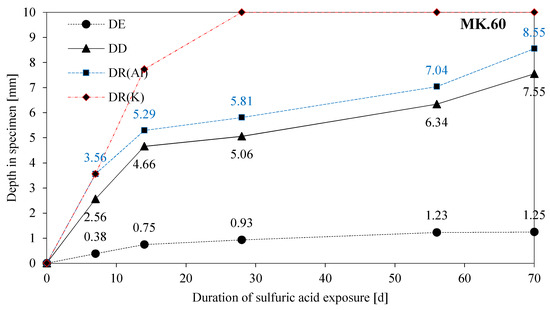 DD and DR(Al) of MK60 14 d sample progressed into deeper zones than in the case of MK54, however, the following percentage increase of DD and DR(Al) is less pronounced in the case of MK60. This may lead to the conclusion, that the chemical reaction (1st stage of degradation process) up to 14 days of exposure is most influenced by the higher porosity and the bigger pores of the geopolymer MK60, meaning there is less solid material in the bulk volume of the geopolymer that needs to be dissolved. The diffusion-controlled reaction (2nd stage of degradation process) after 14 days of exposure may be most influenced by the total amount of free alkalis in the pores of the geopolymer—a higher neutralization potential—which will slow down further degradation processes.