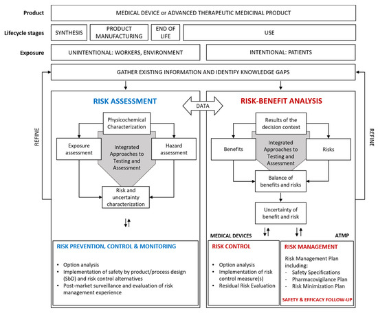 Innovative MD and ATMP containing NBMs could address current unmet therapeutic or diagnostic needs, however they may be developed, manufactured and used in completely new ways compared with conventional medicinal technologies and this can challenge their market authorisation. Therefore, to properly support the translation of NBMs used in MD and ATMP into clinical use, careful assessment of their benefit-risk balance is required [119] and this task is covered by the benefit-risk analysis component of the RMF (right-side pillar, cf. Figure 1).