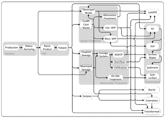 Before existing models for ENMs can be used for NBMs, several adjustments need to be made. In general, these models are also applicable to NBM as most of the parameters are based on the applications of the materials and are not particle-specific properties. A few parameters on fate in technical systems are specific to the type of particles and need to be adjusted to the type of NBM. As NBMs are mostly applied in a hospital setting, waste and wastewater from hospitals need to be included. Healthcare waste is treated differently to municipal waste due to their often-hazardous character. This means that the flows to alternative treatment or hazardous waste incinerators need to be included in the MFA model. NBMs can also be applied inside the body and stay there until the patient’s death, e.g., from their use in implants. Thus, the inclusion of crematoria or burial in cemeteries in the model is necessary. A generic model for the flows of NBM through all life-cycle stages is shown in Figure 2. The main release point is the use of the NBM in a hospital setting, with releases to waste treatment and wastewater treatment specific for the use of the investigated NBM. Depending on the type of materials (organic/inorganic) transformation can occur in several compartments such as wastewater treatment or waste incineration.