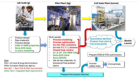To achieve ‘safe-by-design’ of products, additional characterisation and measurements tests and in vitro toxicology tests are added into the raw materials and pilot plant development stages (shown in green in Figure 3). These can be performed off-line or at-line using high-throughput parallel processing analysers including electron microscopy. On-line analysers are chosen for the pilot scale to enable full process analytical and product quality control. The results are analysed by nano-QSARs data analytics [115,116,117] and critical characterisation and measurement parameters together with those from the high information content on-line analysers, e.g., Raman, FTIR, mass spectrometers [110] to build multivariate statistical process control models. Together these devices are then used to maintain optimised SbD performance throughout the whole manufacturing chain from raw materials to full-scale manufacturing.
