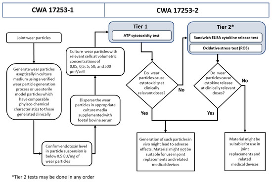 Tiered toolkit flow diagram for evaluating the biological impact of polyethylene wear particles from joint replacements and related medical devices (CWA = CEN Workshop Agreement).