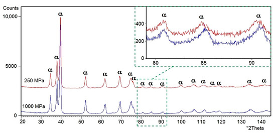 The X-ray diffraction patterns of Ti–35Zr (wt.%) alloys are shown in Figure 2. For the Ti–35Zr alloy, all the diffraction peaks matched well with those of the α phase (ICDD PDF 00-044-1294). This study reveals that the material possesses structure of the α phase, which corresponds to the phase expected from the phase diagram. The Ti–Zr system shows a completely solid solution for both the high-temperature beta phase and the low-temperature alpha phase [28]. The β phase or any intermediate phases were not observed in the recorded XRD patterns. It should be mentioned that the Zr is a neutral alloying element added to a solid solution with titanium because it has an identical allotropic transformation with similar temperature of phase transition [28,29,42]. Previous research [43] has shown that the addition of Zr causes an increase of lattice parameters of the α phase in titanium alloys, due to the larger atomic radius of Zr (1.616 Å) than Ti (1.475 Å) [40]. The results of the refinement using Rietveld’s method confirmed that the addition of Zr causes distortion in an increase of the lattice parameters of the unit cell (Table 1). The change of pressure during manufacturing of the material decreases the unit cell parameters for all of the samples.