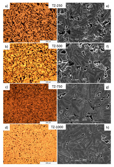 Optical micrographs (a–d) and SEM micrographs (e–h) of Ti–35Zr (wt.%) for different pressure during cold isostatic pressuring of 250 MPa (a,e), 500 MPa (b,f), 750 MPa (c,g) and 1000 MPa (d,h).